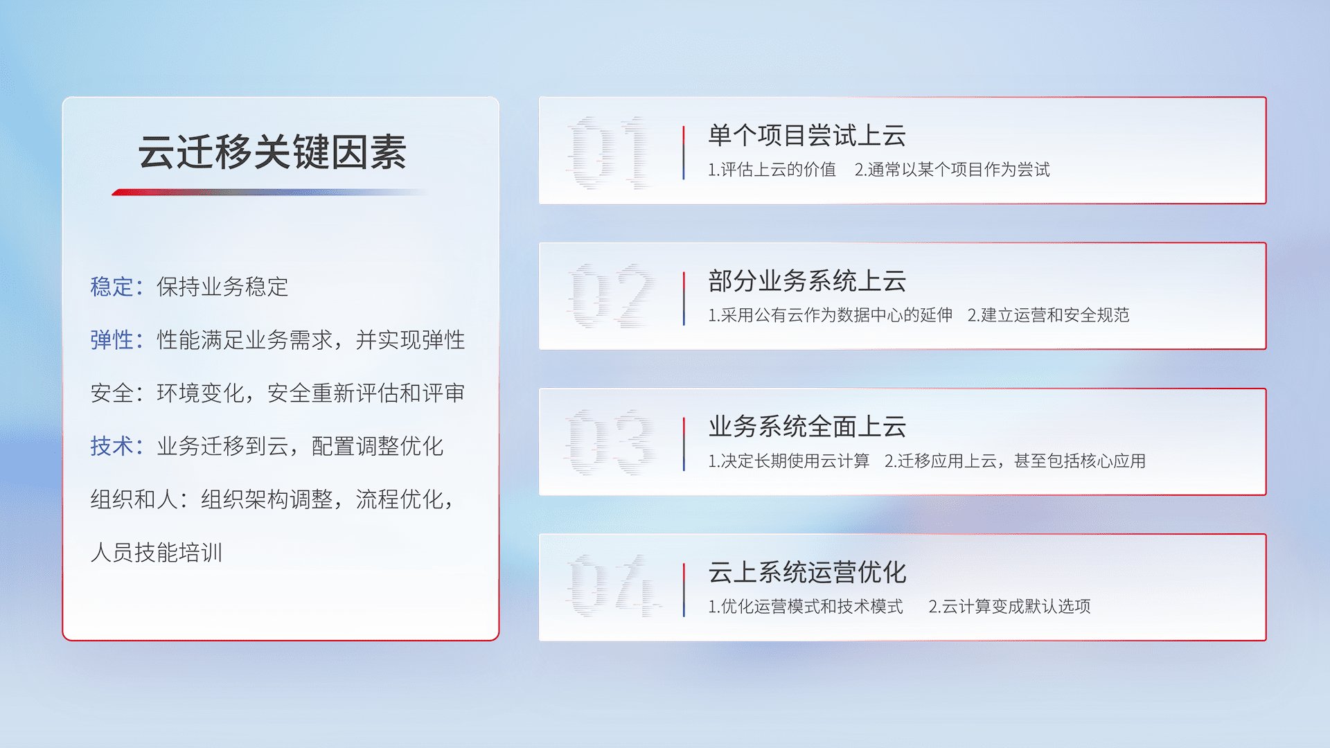 结合实际业务,,,,从规划设计、、云平台选型、、、云原生改造、、数据迁移、、、集成交付,,,,迁移全过程为客户识别最佳上云路径,,做好风险识别管理,,,,设计网络架构、、、、身份权限、、安全审计合规、、操作审计、、、、日志审计、、、、监控告警策略、、多站点容灾设计等,,,,对云上基础设施进行整体规划,,,提升IT治理水平,,,以满足弹性、、、、高可用、、、高性能的需求。。。。